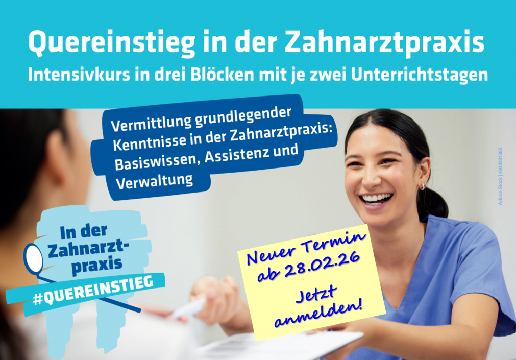 Um diesen sogenannten Quereinsteigern den Start in die Zahnarztpraxis zu erleichtern, hat die BLZK einen Intensivkurs konzipiert, der von den Zahnärztlichen Bezirksverbänden (ZBV) angeboten und durchgeführt wird. In Zusammenarbeit mit dem ZBV München bietet der ZBV Oberbayern diesen sechstägigen Intensivkurs an. Weitere Informationen zu den Inhalten & die Anmeldung für den nächsten Kurs ab 28.02.2026 finden Sie hier